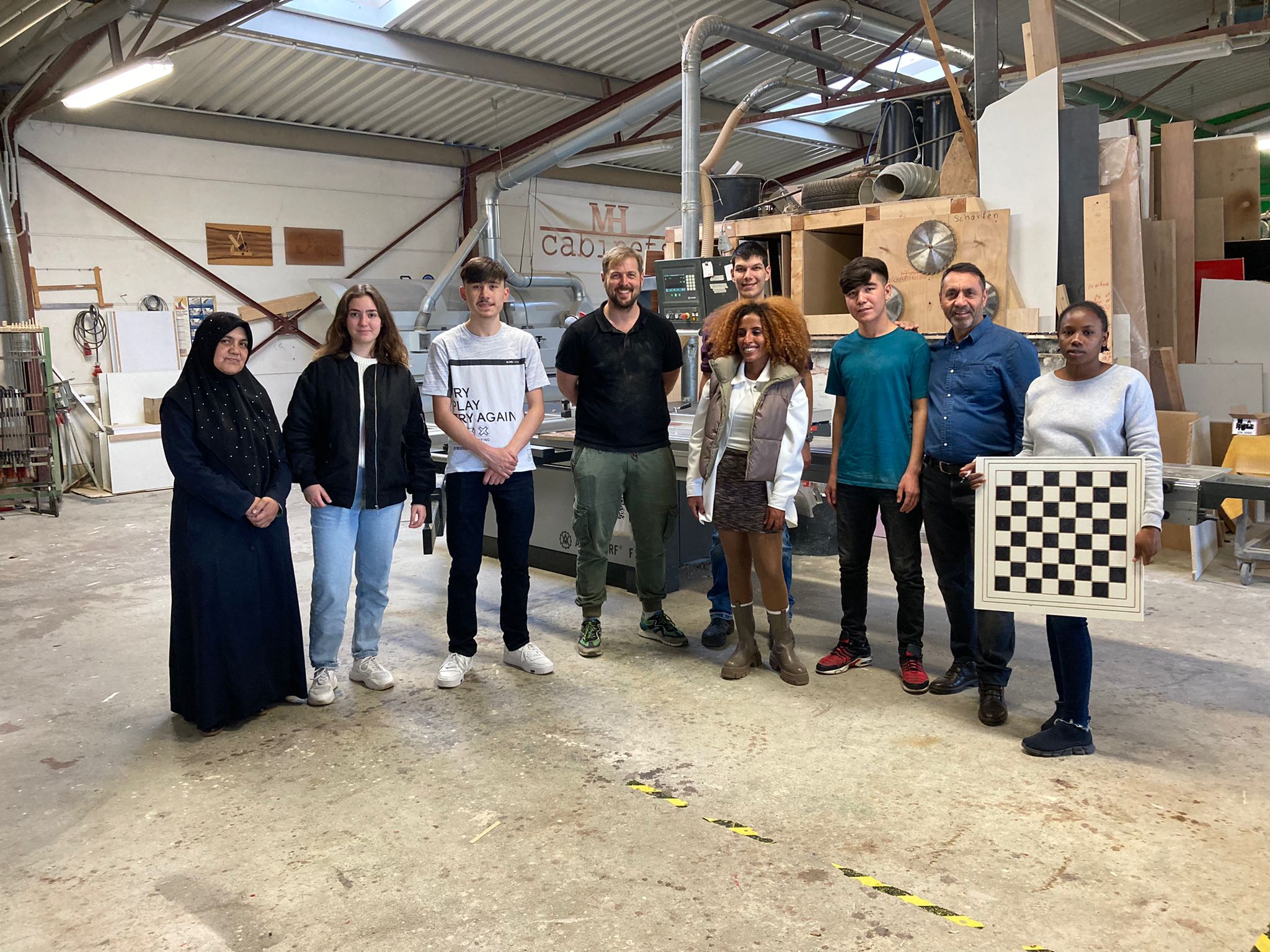 Wieder einmal durfte „Kompass D“ die Schreinerei MHcabinets in Neuss Holzheim besuchen. Konnten die Teilnehmer*innen in den letzten Jahren unter Anleitung des Besitzers und Schreinermeiers Marcel Hoppe ihr Geschick immer beim Bau eines Vogelhäuschens beweisen, so ging es in diesem Jahr um die Herstellung von Brettspielen – zur Auswahl: Schach und Mensch-Ärgere-Dich-Nicht. Mit Hilfe einer CNC Maschine, die von den Teilnehmern bedient wurde, wurden die Spielbretter hergestellt, dann an einer Kantenanleimmmaschine bekantet und zuletzt farbig gestaltet. Am Ende des Tages konnten alle Lernenden mit zwei Spielen und den entsprechenden Mensch-Ärgere-Dich-Nicht Figuren den Heimweg antreten.