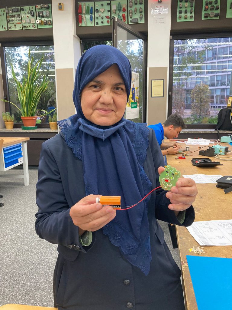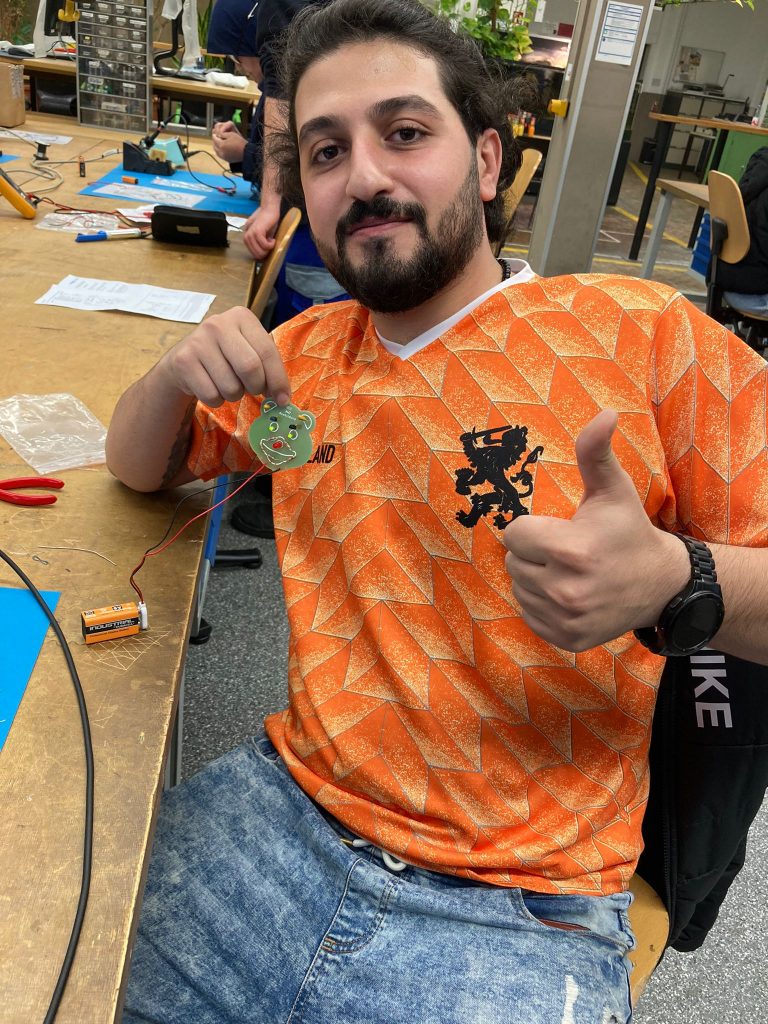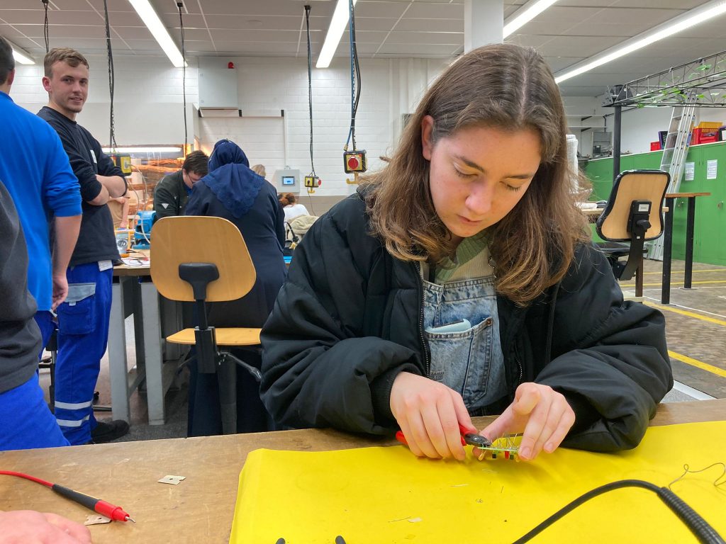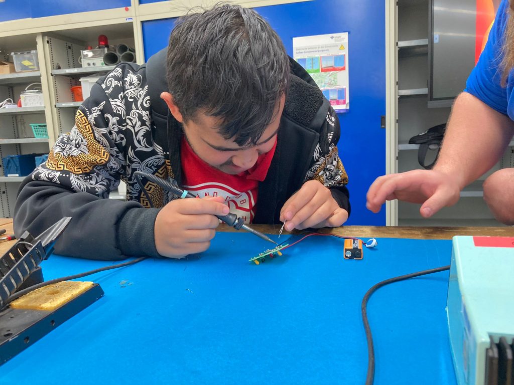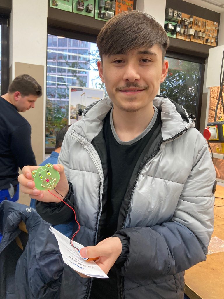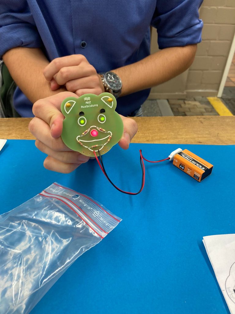 Skeptisch blickten die beiden grünen Leguane der Lehrwerkstatt der Westnetz GmbH auf das Treiben, das sich Ihnen darbot. Elf junge Menschen, Teilnehmende von „Kompass D“, besuchten die Collingstraße 2, um sich von Ausbildungsleiter Adria Kampa und seinen Azubis aus dem 2. Lehrjahr über die Ausbildung zum Elektroniker für Betriebstechnik zu informieren. Nach einem kurzen Vortrag über den Ausbildungsgang, Verdienstmöglichkeiten und Karrierechancen bei der Westnetz GmbH, bei dem auch die Qualität von Sicherheitsschuen überprüft wurde, konnten die Lernenden ihr eigenes Geschick unter Beweis stellen. Mit Hilfe der engagierten Auszubildenden, die extra für „Kompass D“ länger geblieben waren, bauten und löteten sie einen Bären mit Leuchtnase und Leuchtaugen zusammen. Eine schöne Erinnerung an eine sehr kurzweilige Betriebserkundung.