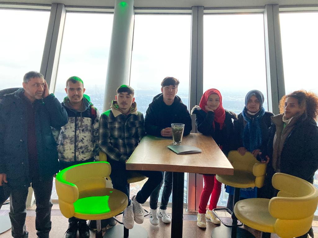 Um sich ein noch besseres Bild von dem Gesehenen machen zu können, ging es zum Ende des Ausflugs hinauf auf den Düsseldorfer Rheinturm. In einer Höhe von 168 Metern bot sich den Lernenden, auch bei diesigem Wetter, ein guter Blick auf die Landeshauptstadt mit dem Regierungsviertel, aber auch auf das linksseitige Neuss.