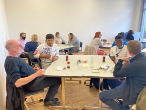 §M- Lesementoren und „Kompass D“ Teilnehmer beim Kennenlerntermin auf der Dachterrasse der VHS Neuss.