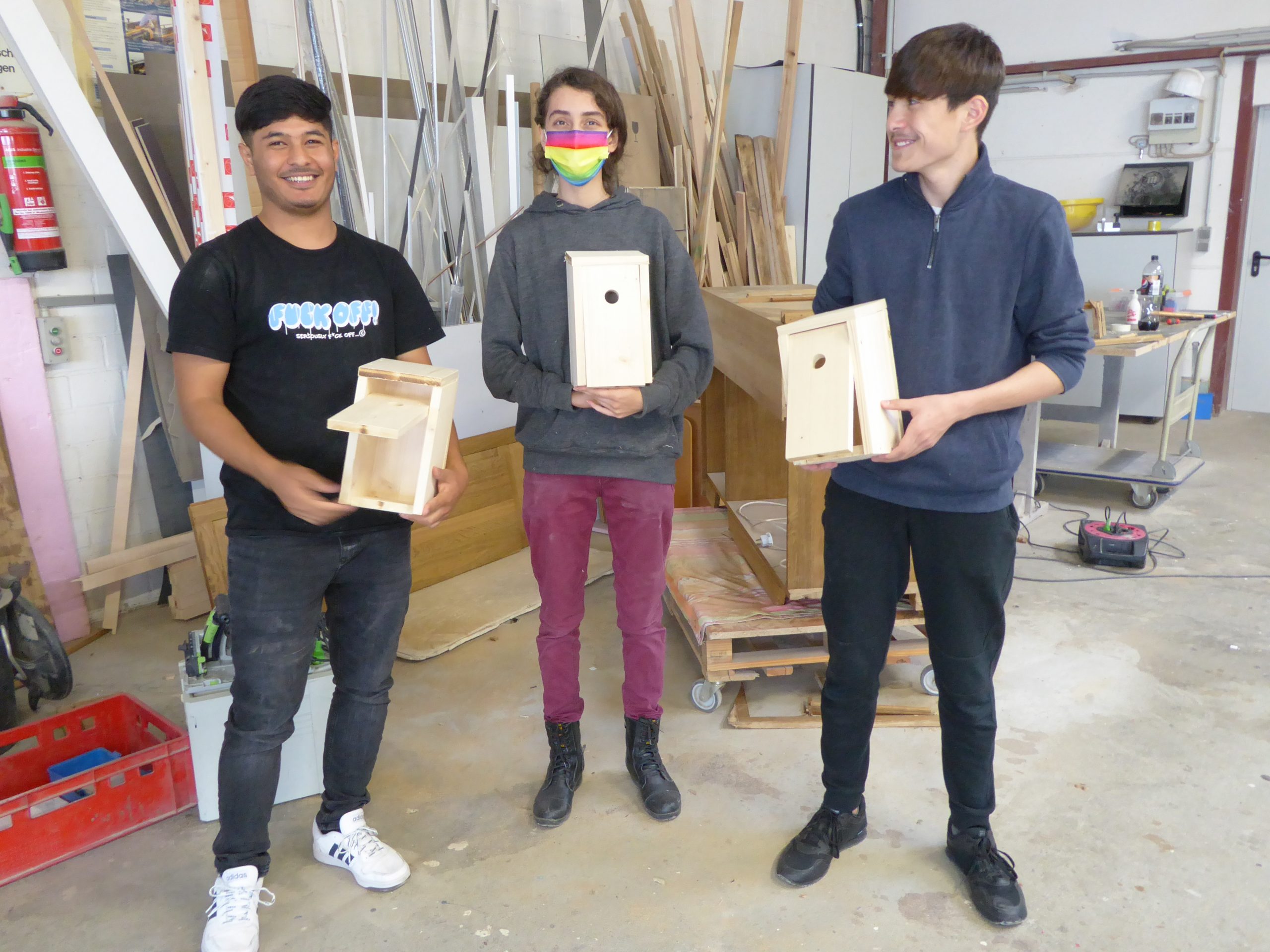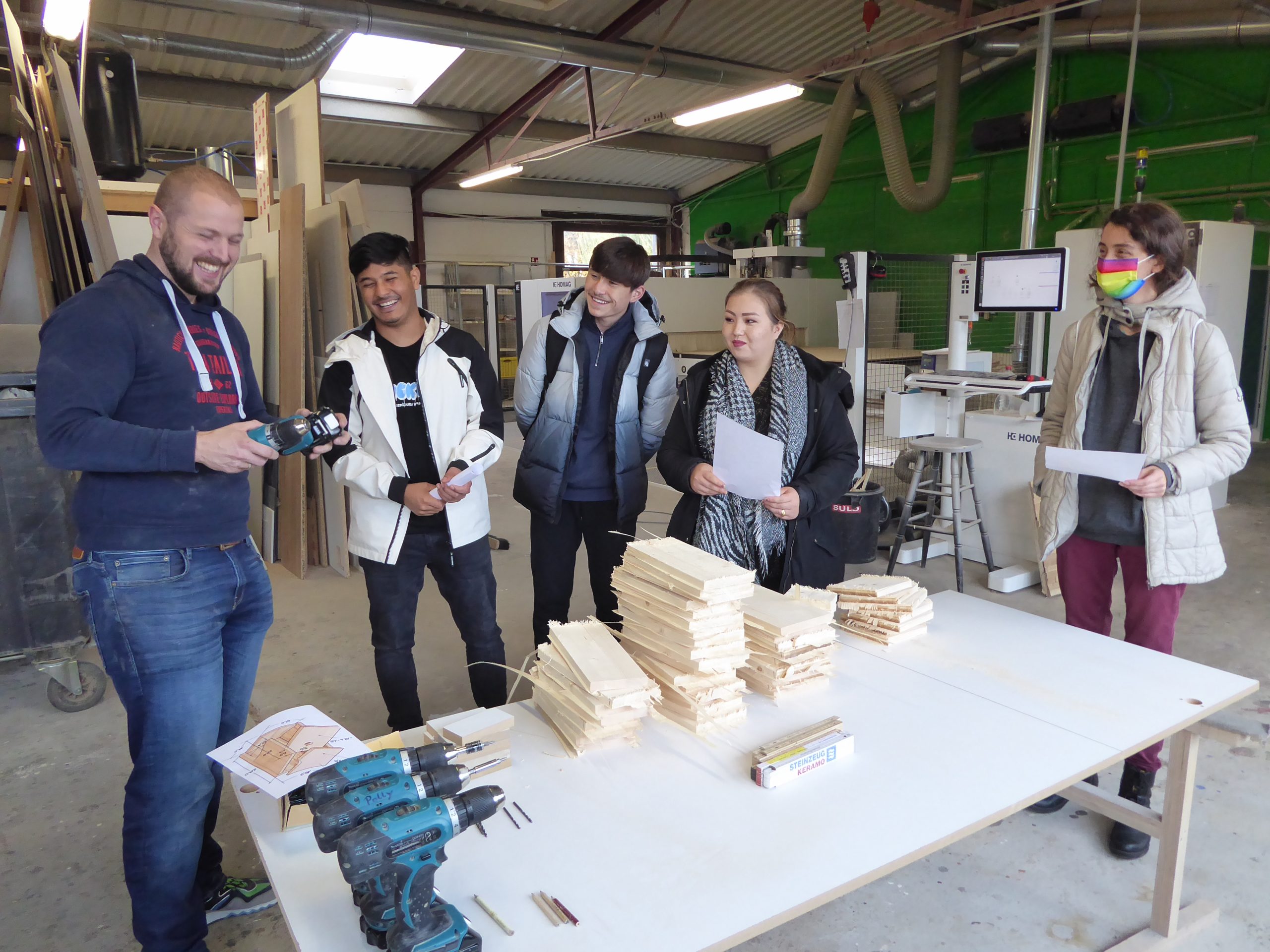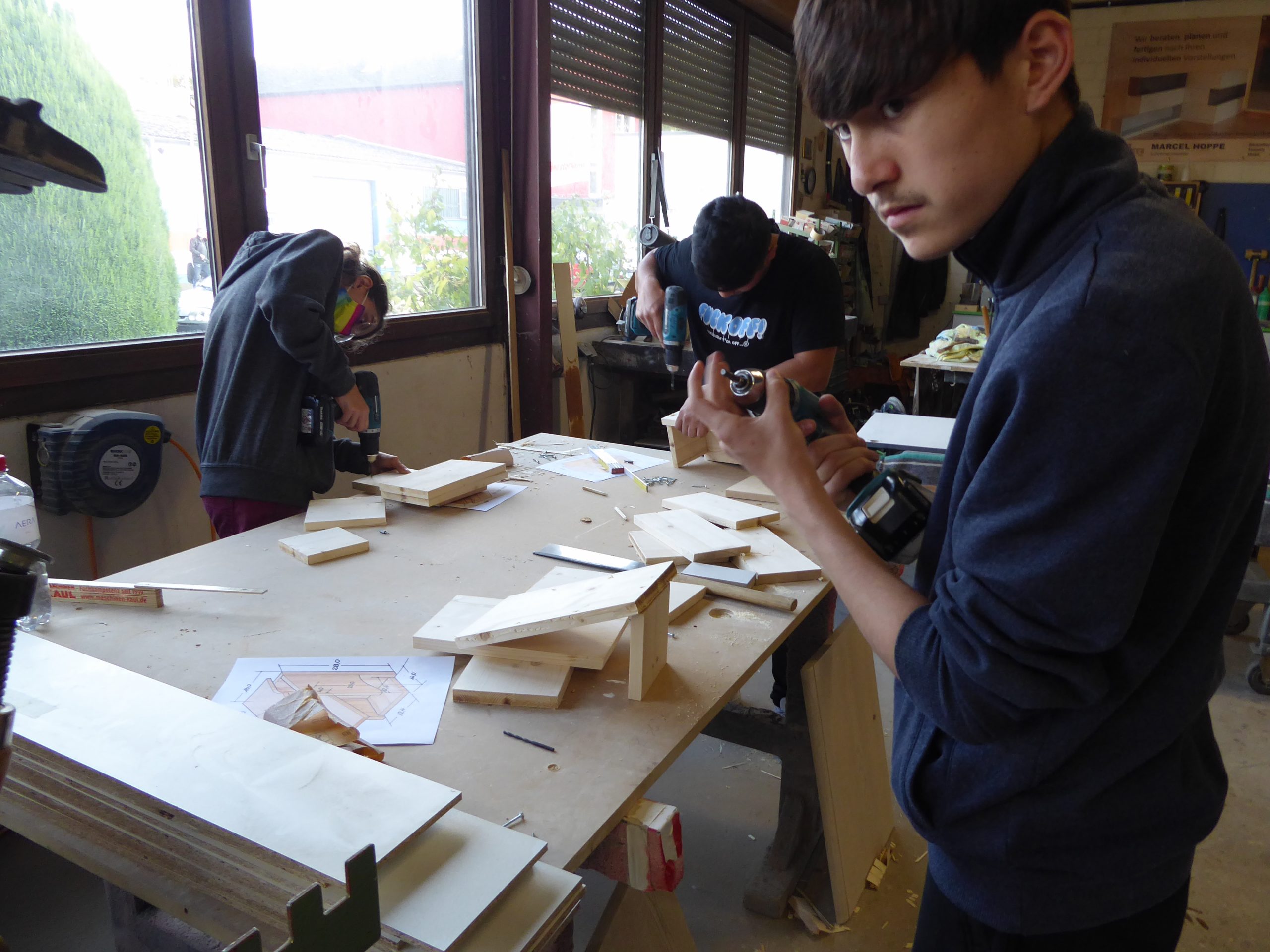 In zwei Stunden leitet er dann die „Kompass D“ Teilnehmer beim Bau eines Vogelhäuschens an, das die Teilnehmer/innen dann zum Schluss mit nach Hause nehmen können.