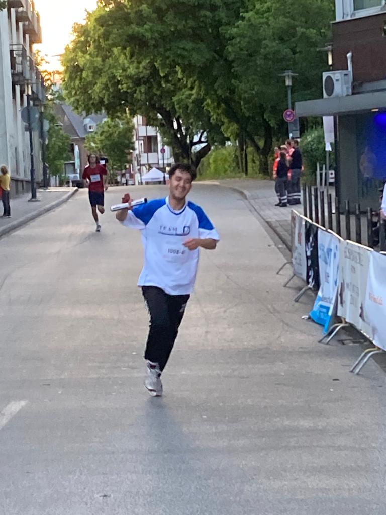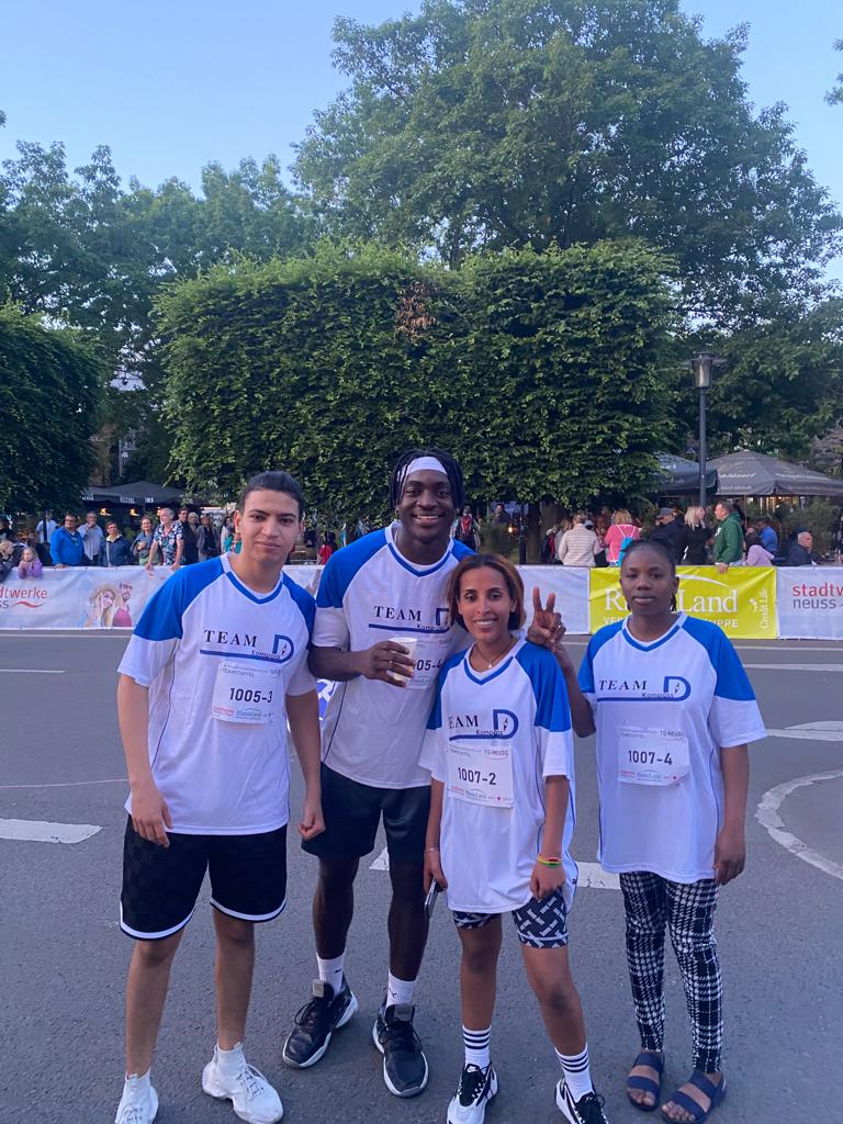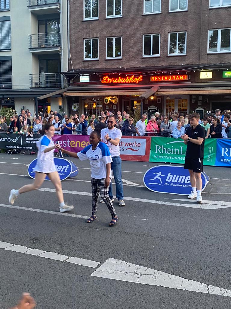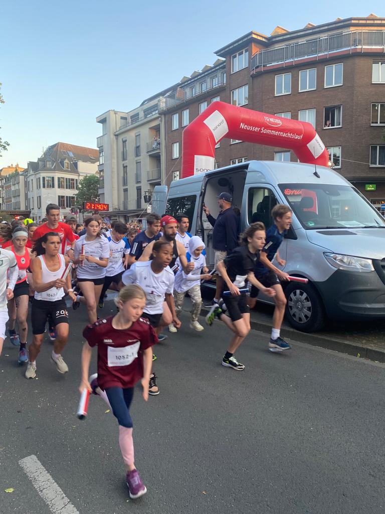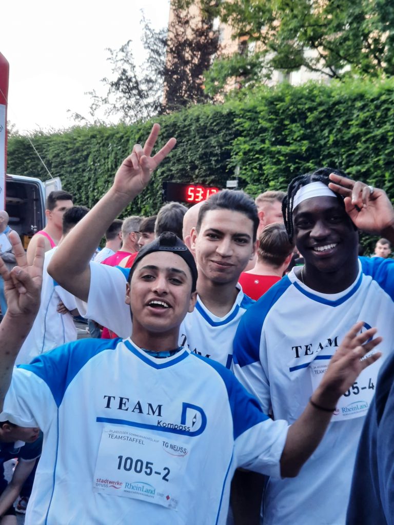 Strahlender Sonnenschen, 25° Celsius und mehr als 15.000 Zuschauer bildeten die stimmungsvolle Kulisse für den 39. Neusser Sommernachtslauf der TG Neuss am 03. Juni. Fast 3.700 Läuferinnen und Läufer waren für die verschiedenen Laufwettbewerbe gemeldet, deren Höhepunkt, wie in jedem Jahr, der Staffelwettbewerb am Ende der Veranstaltung war. Mit dabei auch fünfzehn Läuferinnen und Läufer vom Team „Kompass D“. Vier Staffeln aus Dormagen, Neuss und Norf, davon eine komplette Damenstaffel vom Theodor-Schwann-Kolleg, trafen sich an der VHS Neuss um von dort zum Start am Drusushof zu gehen. Punkt 21.10 fiel der Startschuss. Alle vier Teams erreichten das Ziel. Den krönenden Abschluss machte das Damenteam aus Norf. Mit mehr als 27 Minuten kam es zwar als letztes Team ins Ziel, wurde aber, begleitet von den anderen Teamstartern, von den ausharrenden Zuschauern frenetisch gefeiert. Dank „Kompass D“ einer der längsten dauernden Neusser Sommernachtsläufe – ganz im Zeichen des Teamgeistes. „Kompass D“ wirkt – seit 2016.