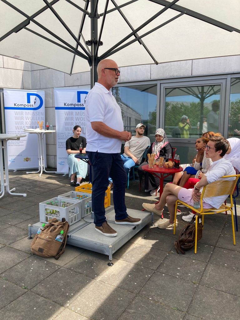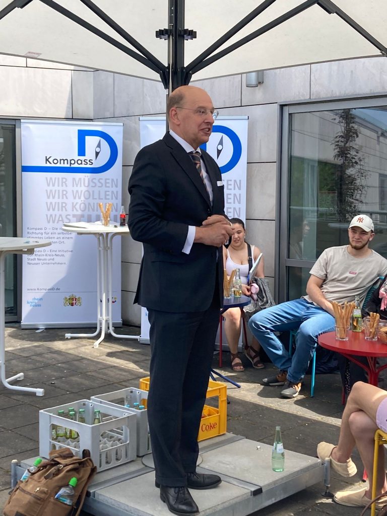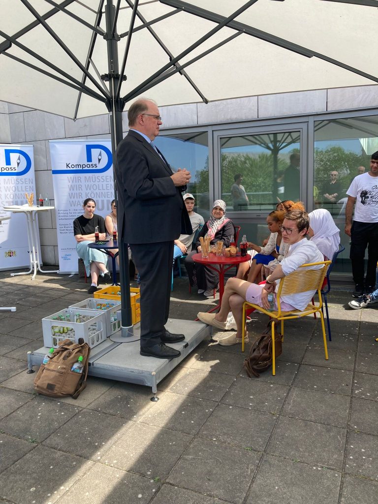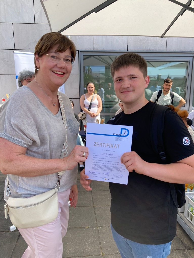 Bei strahlend schönem Wetter verlieh „Kompass D“ am 19. Juni auf der Dachterrasse der VHS Neuss seinen Lernenden die Zertifikate (mehr zu unseren Zertifikaten). Besondere Gäste waren der Schuldezernent des Rhein-Kreis Neuss, Herr Tilmann Lonnes, und der Beigeordnete für Jugend, Soziales und Senioren der Stadt Neuss, Ralf Hörsken. Nach einleitenden Worten des Projektkoordinators Johann-Andreas Werhahn, sprachen sie den jungen Lernenden großes Lob aus und ermutigten sie, ihren Weg in dem für sie neuen Land weiterhin zielstrebig zu verfolgen. Auf einen 7-minütigen, filmischen Rückblick auf das Lernjahr 2022/23, folgte die Übergabe der Zertifikate an die Lernenden – Auszeichnungen für ein Jahr harte Arbeit, Verzicht auf Freizeit und hohem persönlichem Engagement im Unterricht. Für viele der jungen Menschen das erste offizielle Zeugnis in ihrer neuen Heimat.