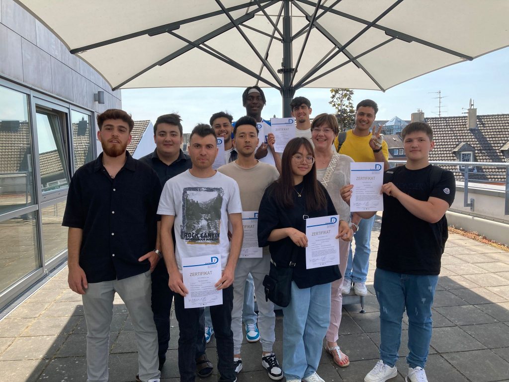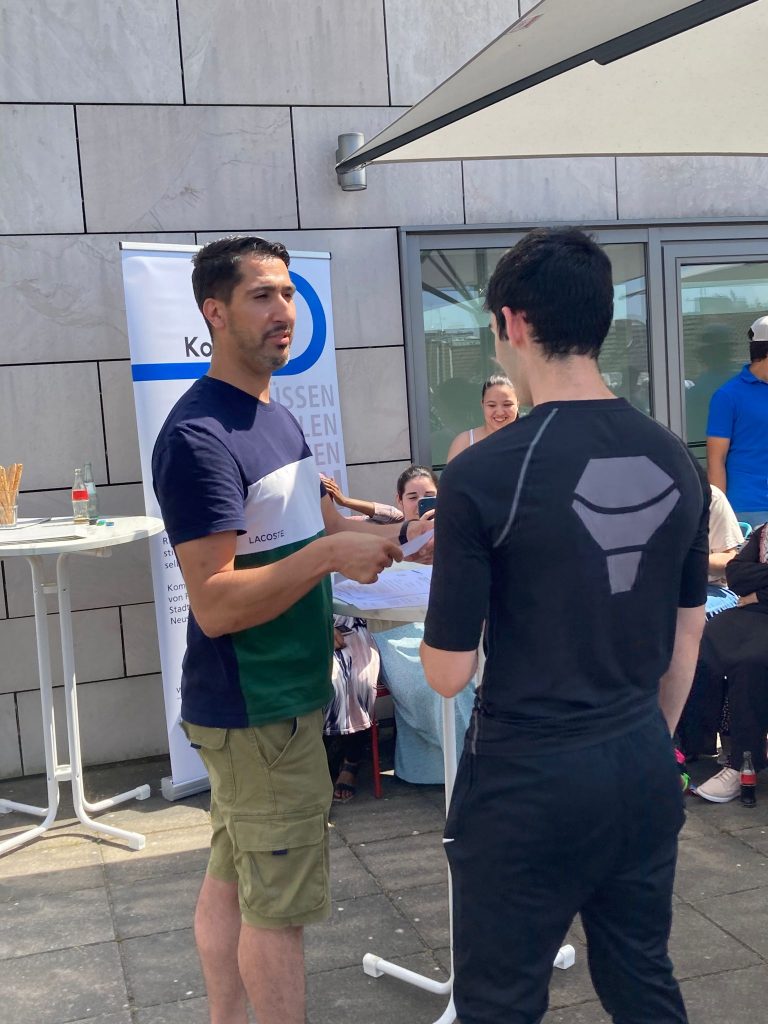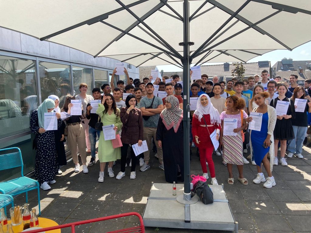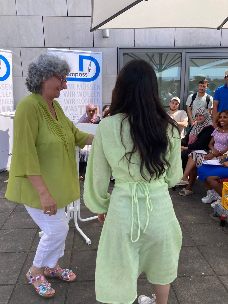 Bei strahlend schönem Wetter verlieh „Kompass D“ am 19. Juni auf der Dachterrasse der VHS Neuss seinen Lernenden die Zertifikate (mehr zu unseren Zertifikaten). Besondere Gäste waren der Schuldezernent des Rhein-Kreis Neuss, Herr Tilmann Lonnes, und der Beigeordnete für Jugend, Soziales und Senioren der Stadt Neuss, Ralf Hörsken. Nach einleitenden Worten des Projektkoordinators Johann-Andreas Werhahn, sprachen sie den jungen Lernenden großes Lob aus und ermutigten sie, ihren Weg in dem für sie neuen Land weiterhin zielstrebig zu verfolgen. Auf einen 7-minütigen, filmischen Rückblick auf das Lernjahr 2022/23, folgte die Übergabe der Zertifikate an die Lernenden – Auszeichnungen für ein Jahr harte Arbeit, Verzicht auf Freizeit und hohem persönlichem Engagement im Unterricht. Für viele der jungen Menschen das erste offizielle Zeugnis in ihrer neuen Heimat.