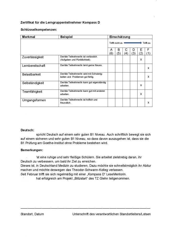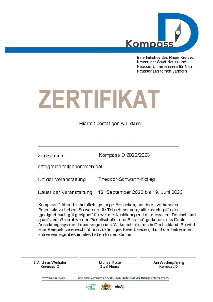 In unseren Zertifikaten bestätigt „Kompass D“ den Neu-Neussern, dass sie „teamfähig“, „zuverlässig“ und „engagiert“ teilgenommen haben. Sie werden einmal i Jahr zum Endes des Lermjahres verliehen.