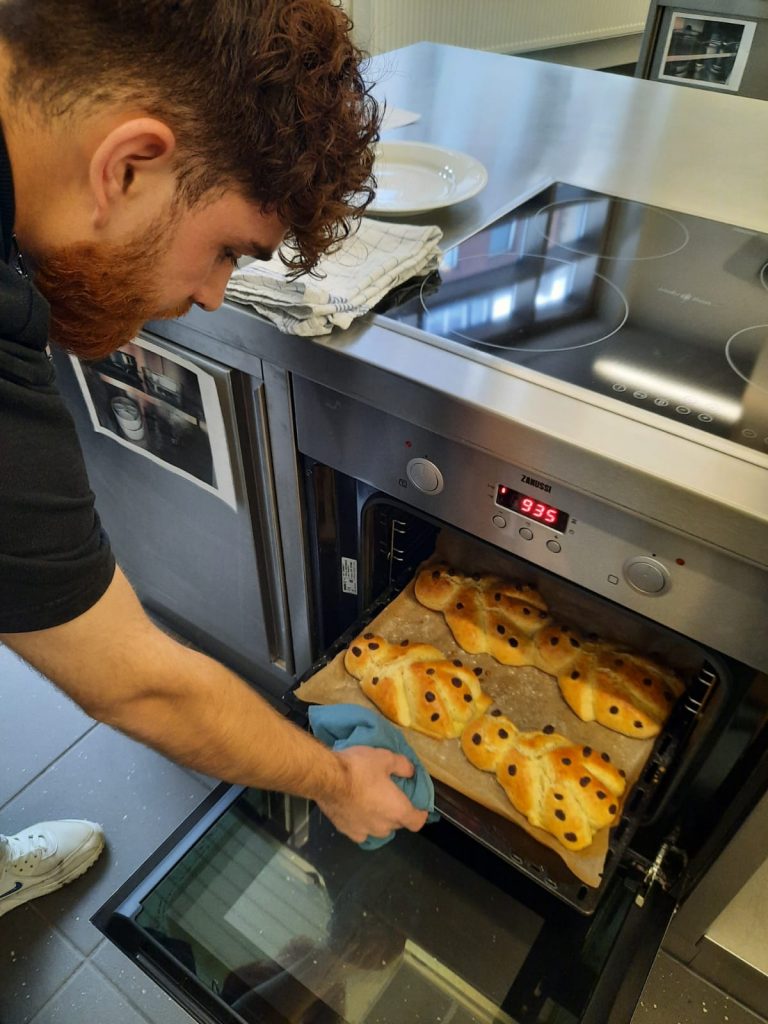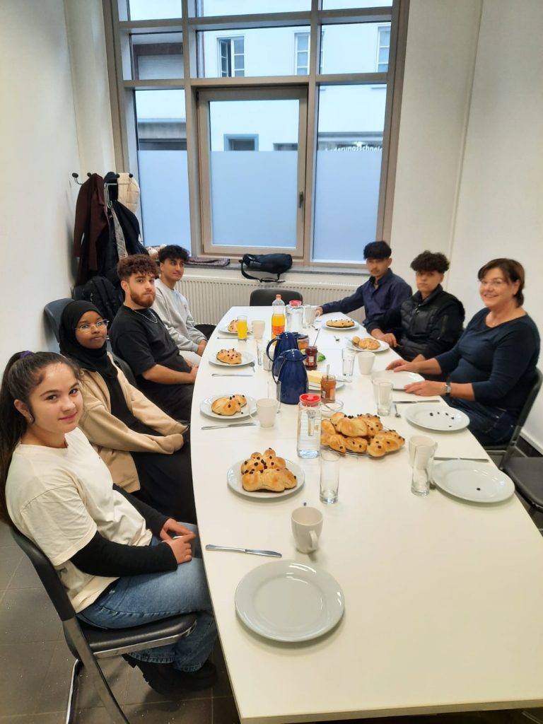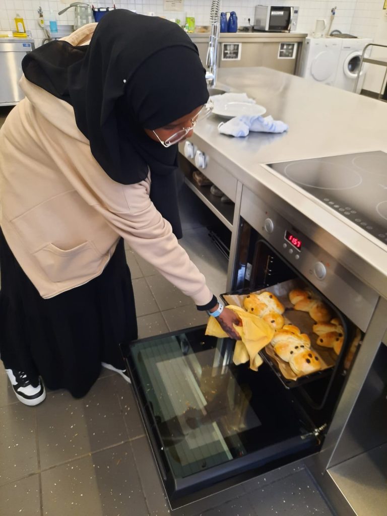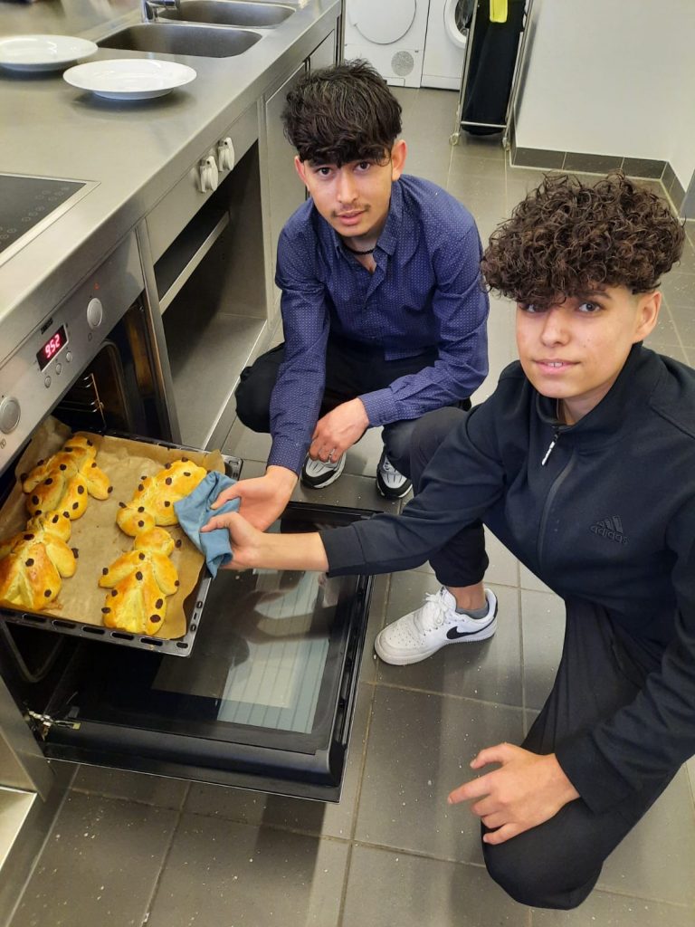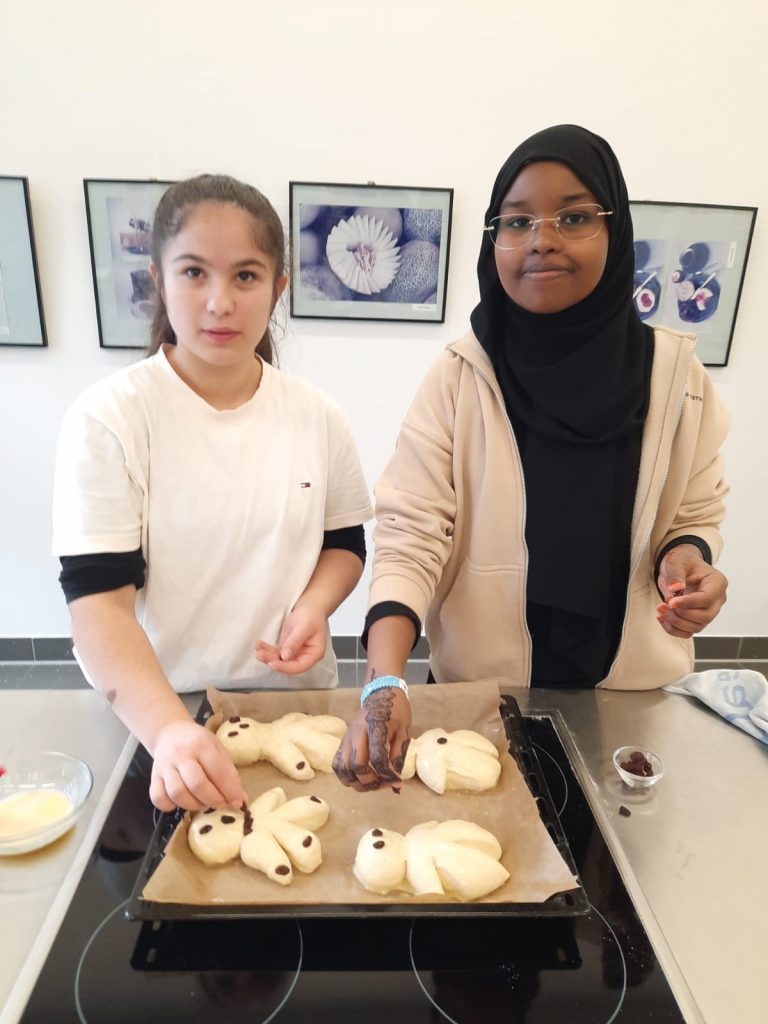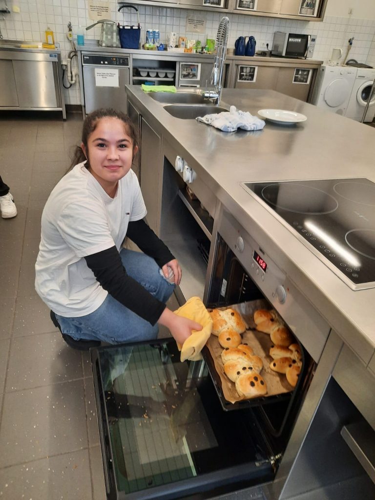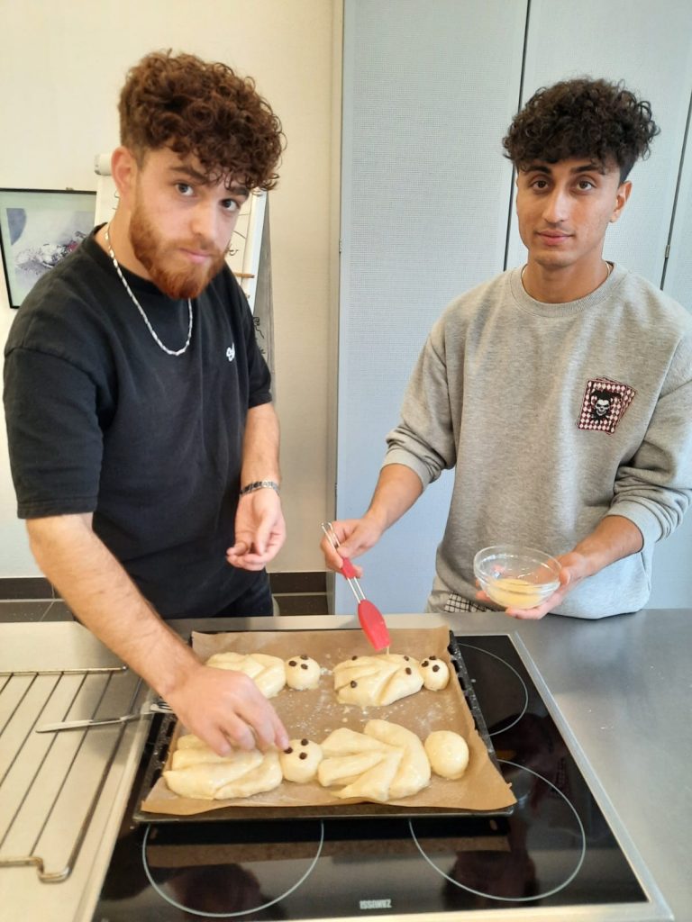 St. Martin ist die Zeit des Teilens, der Fackelzüge und Mantelteilungen – und natürlich auch der Weckmänner. Grund genug für einige Lernende des „Kompass D“ Standortes am Berufskolleg Weingartstraße, sich mit ihrer Dozentin Barbara Nießen in der Lehrküche der VHS zu treffen, um dort Weckmänner zu backen. Es wurde Teig geknetet, Weckmänner geformt und mit Rosinen verzehrt, gebacken und natürlich auch gegessen. Und ganz nebenbei erfuhren die jungen Menschen Einiges zur Tradition und Bedeutung des Festes.