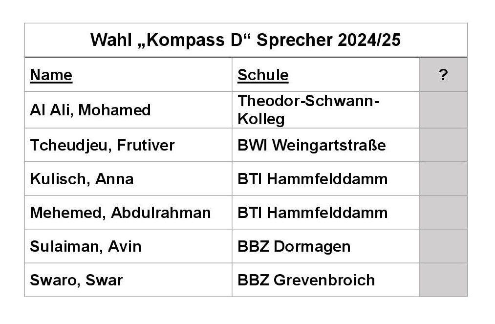 Bei 53 angegebenen Stimmen, davon eine ungültig, wurde Frau Avin Sulayman aus dem BBZ Dormagen mit 27 gültigen Stimmen zur „Kompass D“ Sprecherin gewählt.