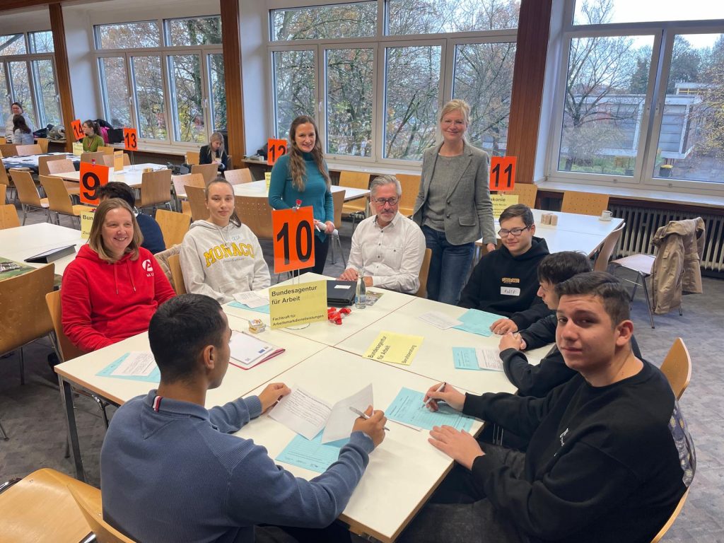 Claudia Trampen, Leiterin Kommunale Koordinierung KAoA des Rhein-Kreis Neuss und verantwortlich für die Durchführung des Berufsparcours, besuchte gemeinsam mit ihrer Kollegin Tanja Mietzner den Berufsparcours. Hier am Stand der Agentur für Arbeit am BBZ Grevenbroich. Auch dabei ehemalige Teilnehmende von „Kompass D“, die nun die Oberstufe besuchen,