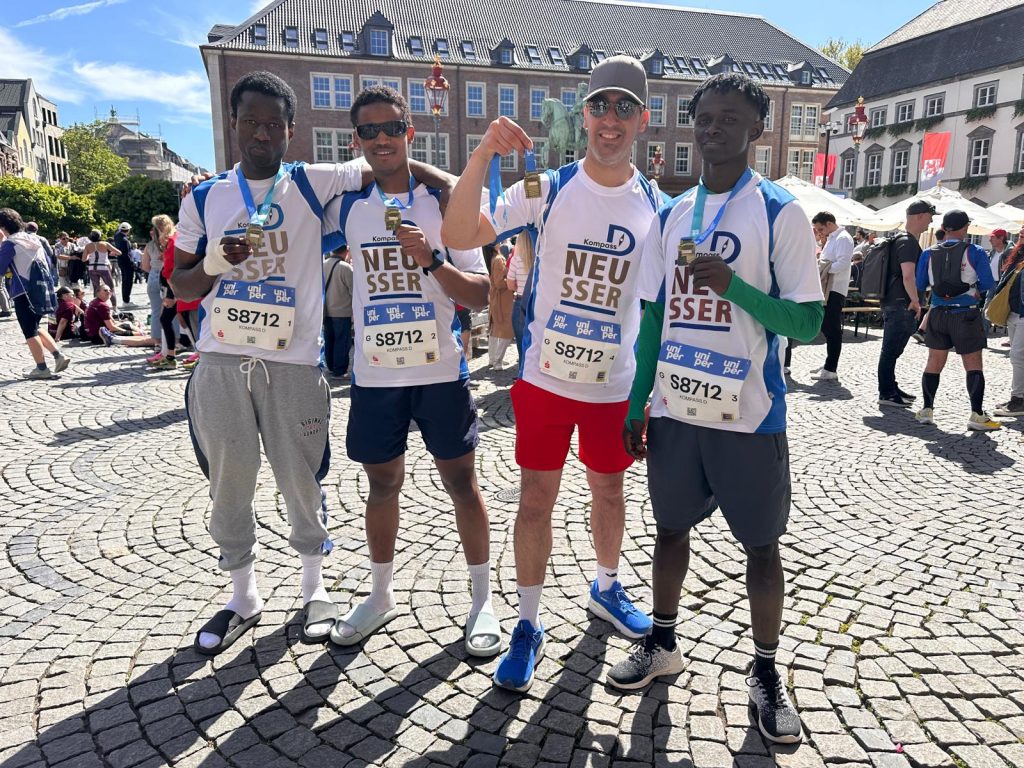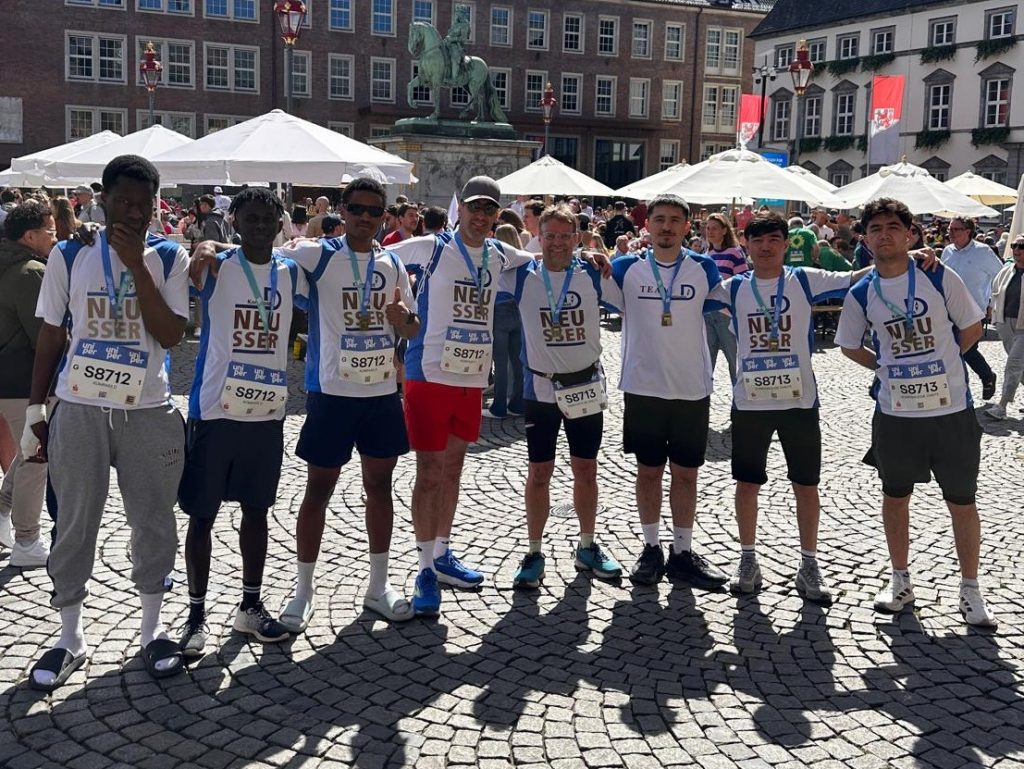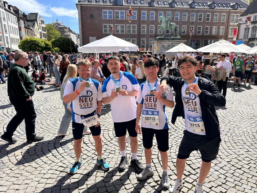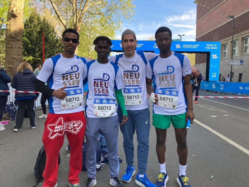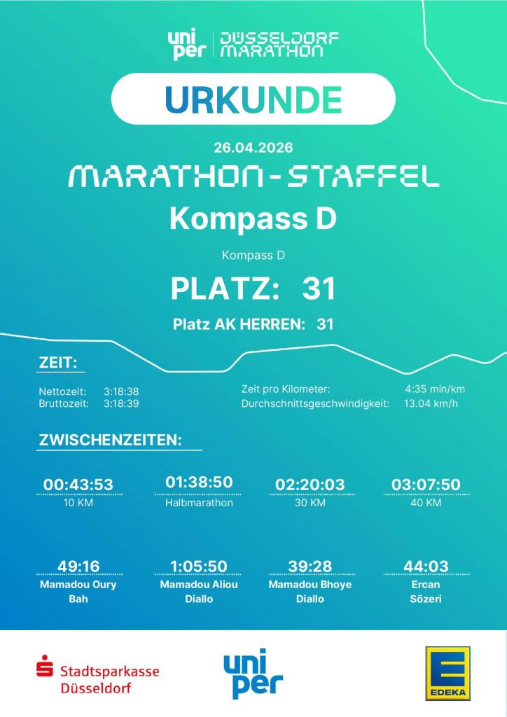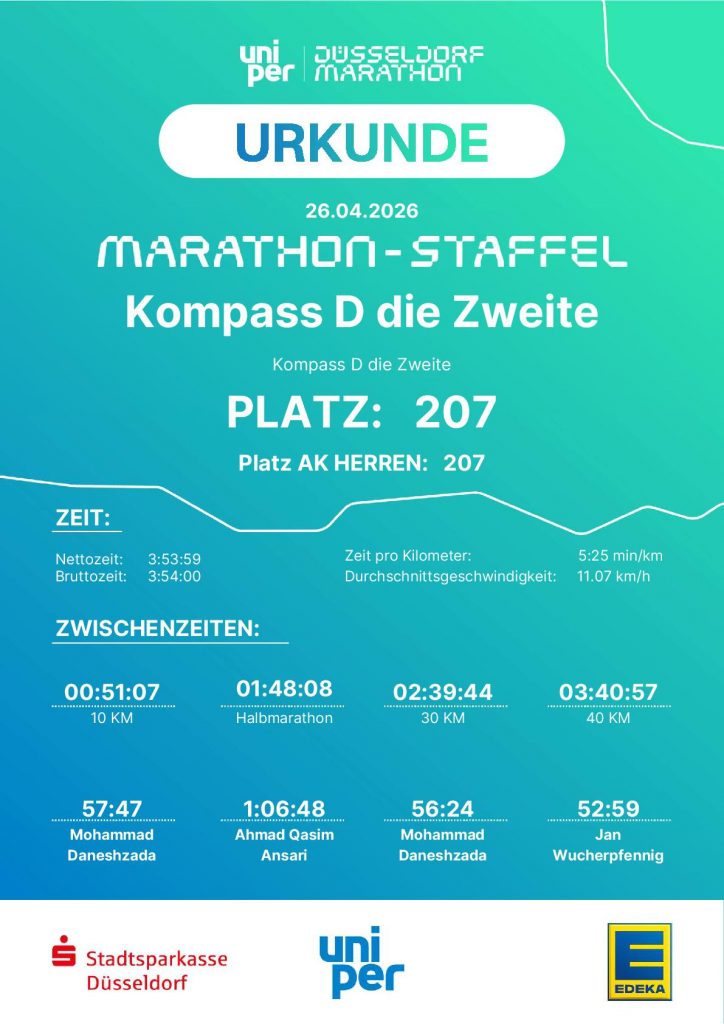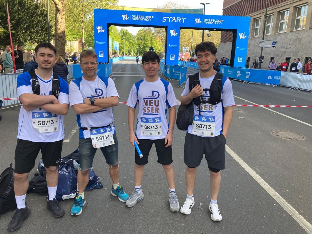 Früh am Sonntagmorgen trafen sich sechs Teilnehmer von „Kompass D“ und die Lotsen Ercan Sözeri und Jan Wucherpfennig, um gemeinsam mit zwei Staffeln am Uniper Düsseldorf Marathon teilzunehmen. 23.ooo Läufer hatten sich insgesamt für Halbmarathon, Marathon und Marathonstaffel angemeldet. Mit jeweils vier Läufern ging es auf die 42,195 km lange Strecke durch Düsseldorf, an deren Wegesrand zahlreiche DJs und Musikgruppen für eine fantastische Stimmung sorgten. An dem Tag, an dem in London zum ersten Mal ein Läufer die 42 Kilometer unter der magischen zwei Stunden Marke lief, erreichten die beiden „Kompass D“ Staffeln in Gesamtzeiten von 3:18:38 (Platz 31) und 3:54:00 (Platz 207). Für die schnellere Staffel bedeutete dies Platz 31 von 381 Herren Staffeln und Platz 55 von allen 1588 Staffeln!